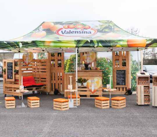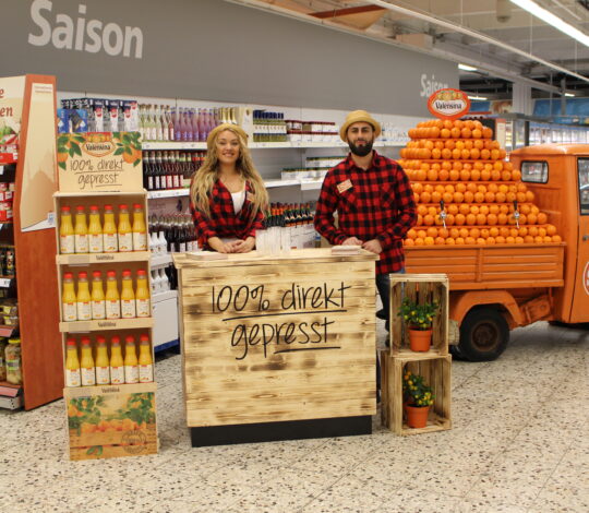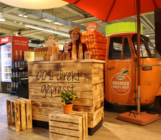 Zwei Jahre in Folge waren wir mit Valensina quer durch Deutschland auf Streetfood Festivals zu Gast. Unser vierköpfiges Promotionteam versorgte dabei die Streetfood Besucher in den Städten mit einem frisch gemixten Valensina Cocktail bzw. Smoothie und sorgte mit dem Love-Tester Spiel und den dazugehörigen Saftgläsern für ein nachhaltiges Markenerlebnis. Besonders die Hollywood-Schaukel und die Sitzkisten erfreuten sich großer Beliebtheit und luden zum Verweilen ein. Mit Valensina LEH haben wir direkt im Markt Probiermomente geschaffen. Der Eyecatcher: Ein stilechter Valensina APE, welcher die Verbindung zu sonnengereiften Orangen herstellt.